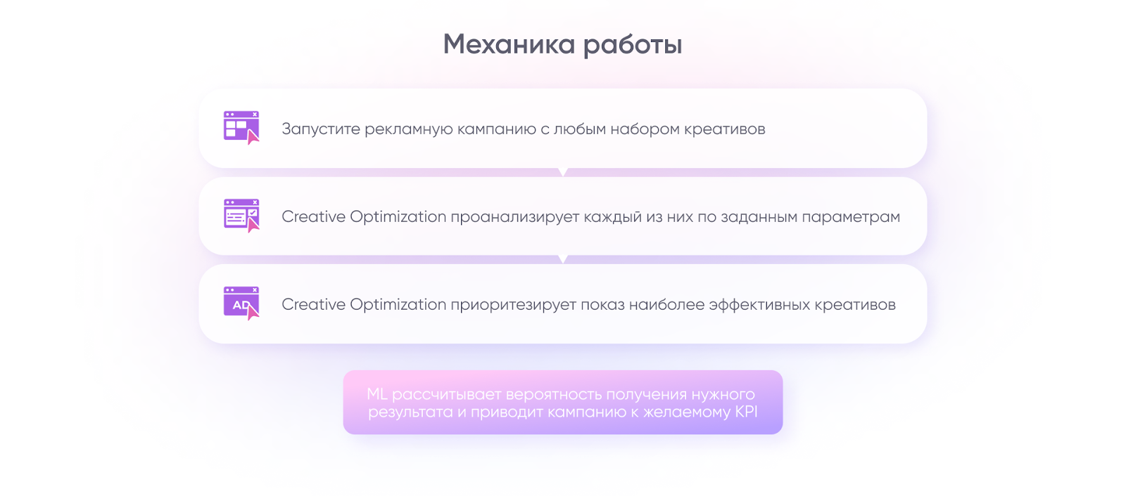 Это инструмент, который с помощью ML анализирует рекламные баннеры и приоритезирует показ наиболее эффективных из них. Система учитывает ключевые параметры (клики, конверсии и другие целевые действия), и выбирает объявления с максимальной результативностью.