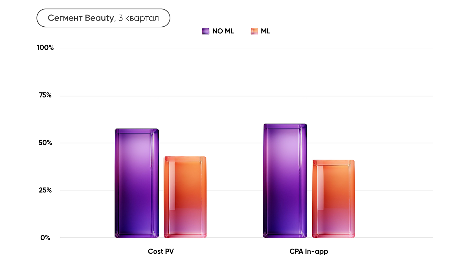В Beauty-сегменте во 2 квартале результаты показали, что в кампаниях с оптимизацией соотношение количества кликов по объявлению к его показам (CTR) уменьшилось всего на 10%. Цена за конверсионное действие в десктопе (CPA Web) и в мобильном приложении (CPA In-App) уменьшились на 25% и 10% соответственно. Количество целевых действий в In-App (MMP) увеличилось на 20%.