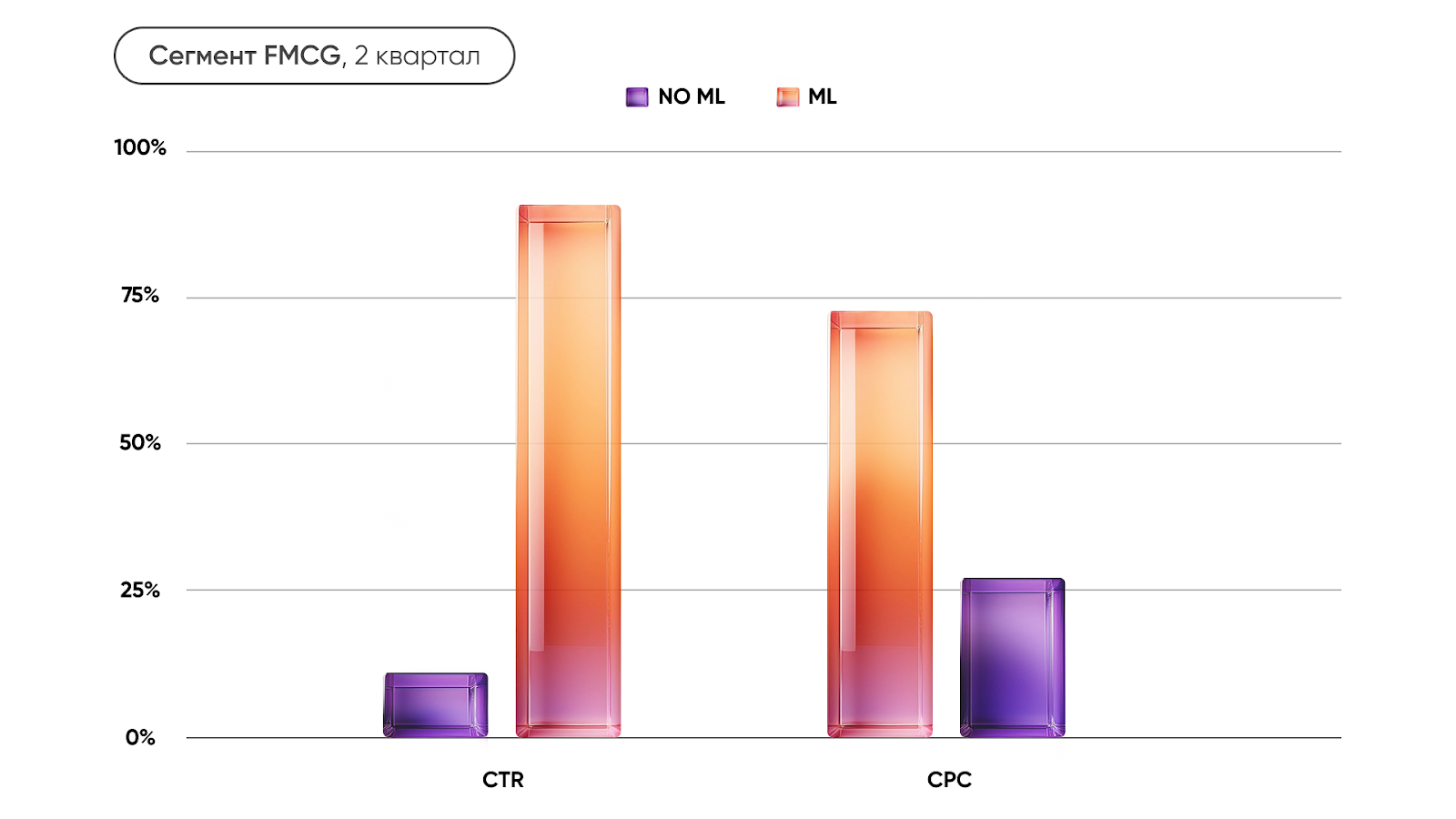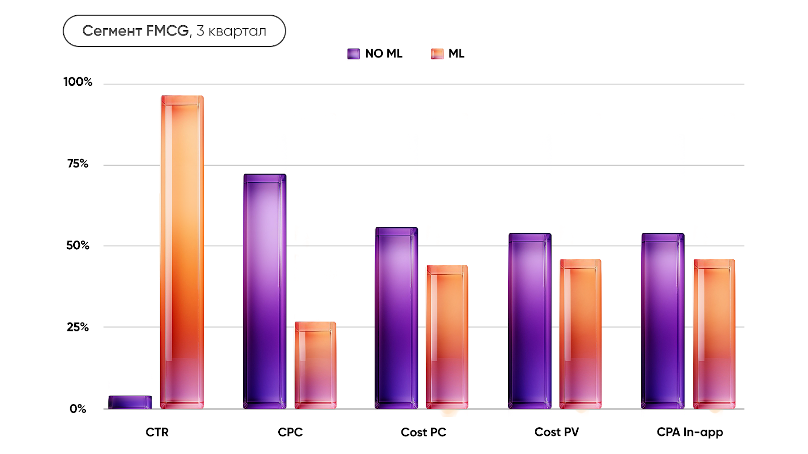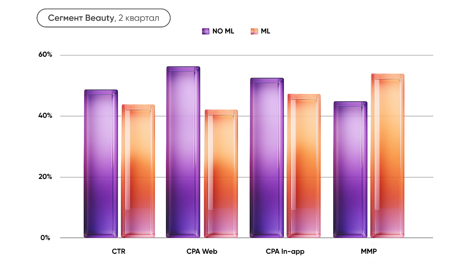 С апреля по сентябрь 2024 года мы провели масштабное исследование, чтобы проверить, как SmartBid влияет на эффективность рекламных кампаний, запущенных в Hybrid Platform. Сравнивались усредненные результаты в сегментах FMCG, Beauty, Fashion и Pharma за 2 и 3-й кварталы.