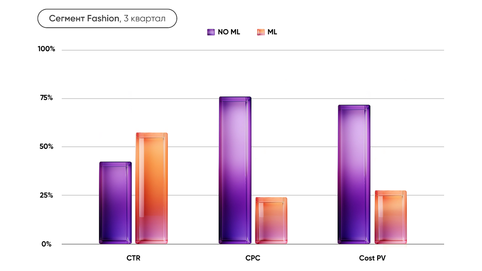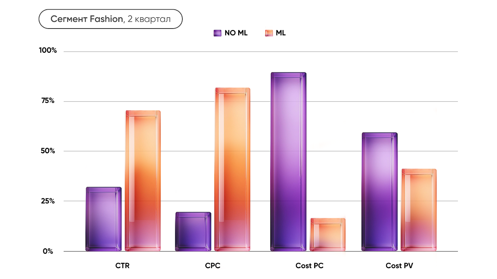 В сегменте Fashion во 2 квартале СТR вырос в 2,5 раза. CPC уменьшилась в 3,5 раза, Cost PC — в 5,5 раз, а Cost PV — в 1,5 раза.